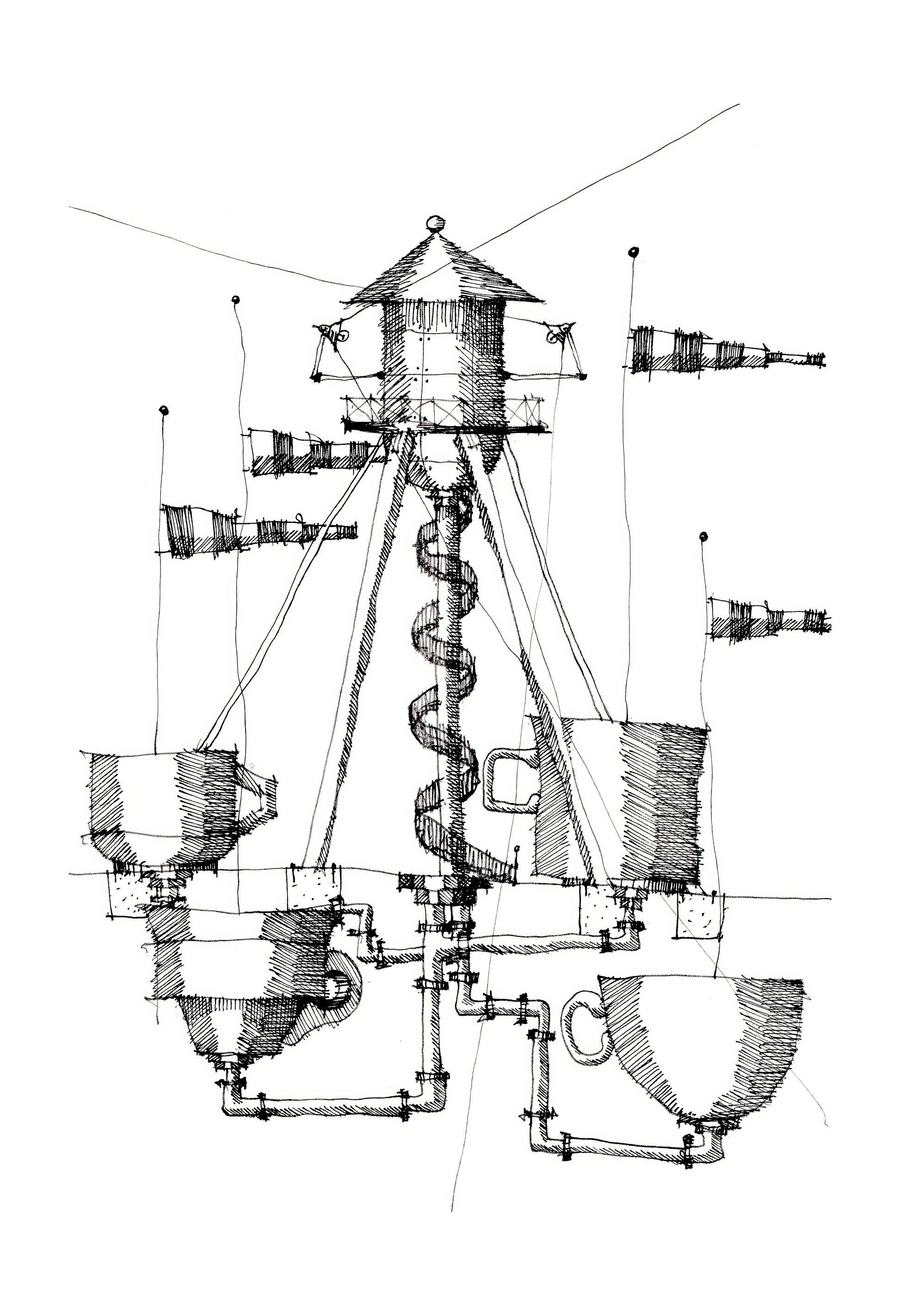 Tirage d'un dessin original sur le thème ludique du café; quand le doux breuvage chaud percole d'une tour de contrôle d'un magnifique monde imaginé par l'artiste